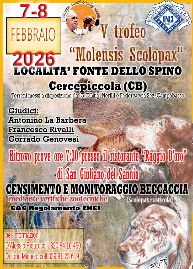 consigliere dell’Enci ed esperto giudice, allevatore di pointer con affisso "Delle Macchie", incaricato nel Pointer Club d’Italia e fondatore del nostro gruppo cinofilo Pentro, va la nostra gratitudine. Sei sempre stato una persona molto determinata, a volte brusca nelle tue azioni ma sei stato sempre apprezzato nella tua carriera cinofila. Hai macinato chilometri dietro ai tuoi pointer sui difficili terreni molisani e non, da qui i primi passi nella cinofilia e la nomina di giudice di prove e giudice all round. L’avvio di questa carriera ti costò parecchia fatica ma non mancò mai la tua preparazione teorica e il tuo colpo d’occhio. Ti sei sempre distinto per la tua franchezza e la tua tenacia, eri sempre pronto al confronto, all’ascolto e al rispetto delle proposte altrui. In un’epoca in cui certi valori sembrano essere smarriti, ti sei distinto nei confronti di tutti e noi oggi dedichiamo a te il nostro gruppo denominato: "Gruppo Cinofilo Luigi Nerilli". Grazie... Soprattutto perché con il tuo esempio ci hai trasmesso l’entusiasmo e la determinazione per la prosecuzione del lavoro da te iniziato.”